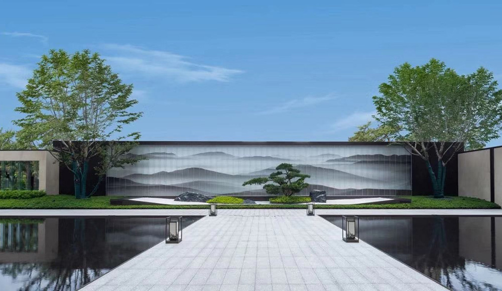 整个墙面采用古典水墨画,搭配软膜画布的材质,将山水的层峦感凸显了出来,搭配钢化玻璃的透明墙体,让整个氛围更加的朦胧,更有意境。